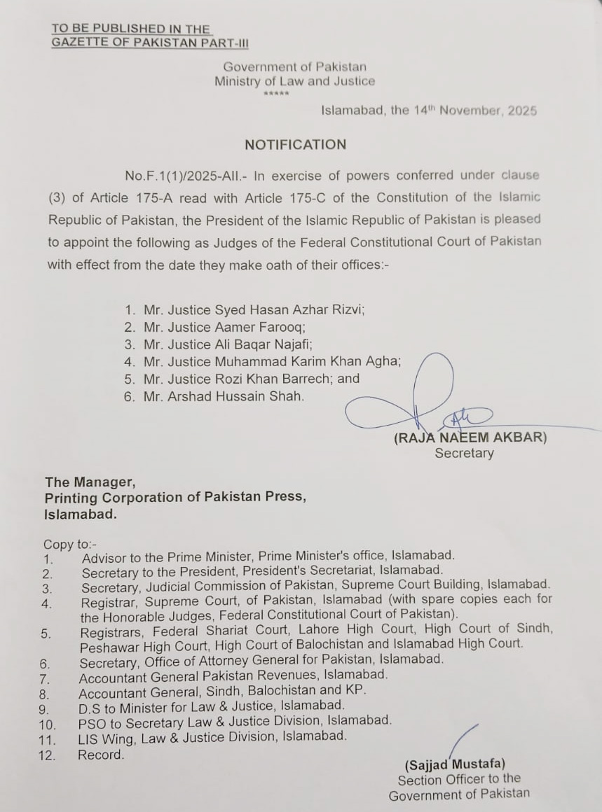 دوسری جانب وزارت قانون نے وفاقی آئینی عدالت کے ججز کا نوٹیفکیشن جاری کر دیا۔ جاری کردہ نوٹیفکیشن کے مطابق وفاقی آئینی عدالت کے 6 ججز ہوں گے، آئینی عدالت میں جسٹس حسن اظہر رضوی، جسٹس عامر فاروق، جسٹس علی باقر نجفی، جسٹس کے کے آغا جج ہوں گے، بلوچستان سے جسٹس روزی خان آئینی عدالت کے جج ہوں گے۔ نوٹیفکیشن کے مطابق پشاور ہائی کورٹ سے جسٹس ارشد حسین شاہ آئینی عدالت کے جج ہوں گے، خرابی صحت کے باعث جسٹس مسرت ہلالی کا نام زیر غور نہیں لایا گیا۔